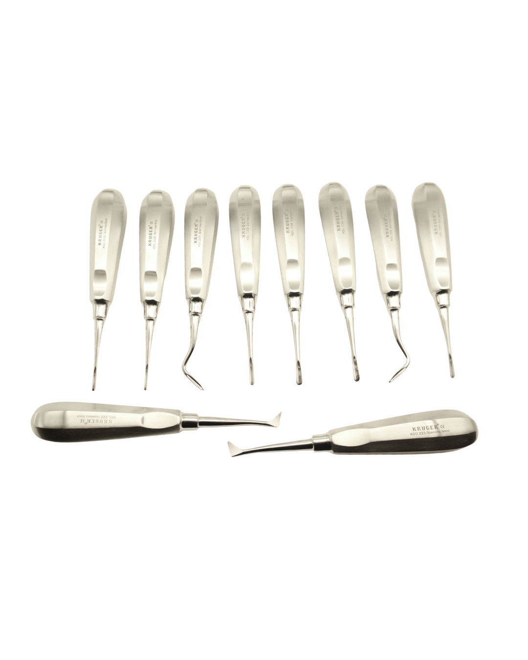 KRUGER 10’lu Elevatör Set, dental cerrahi uygulamalarında diş ve kökleri nazikçe kaldırmak, gevşetmek veya çıkarmak için tasarlanmış profesyonel bir settir. Set, farklı cerrahi ihtiyaçlara uygun 10 adet elevatörden oluşur ve her biri klinik sahada hassas ve kontrollü kullanım sağlar.